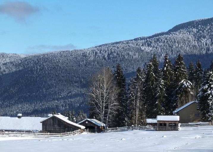 Keywords: winter season cold snow icy landscape scenery fog early morning sunrise canim lake british columbia canada weather nature mood morning glory ranch buildings