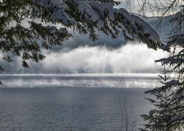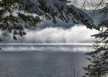 Keywords: winter season cold snow icy landscape scenery fog early morning sunrise canim lake british columbia canada weather nature mood morning glory