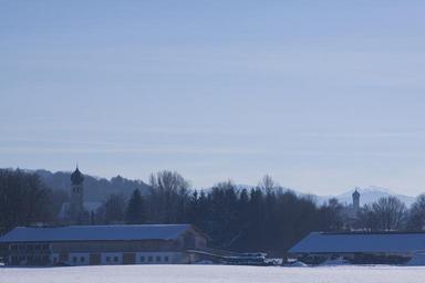 Keywords: winter snow trees mountains churches baroque blue haze upper bavaria landscape idyll forest sky