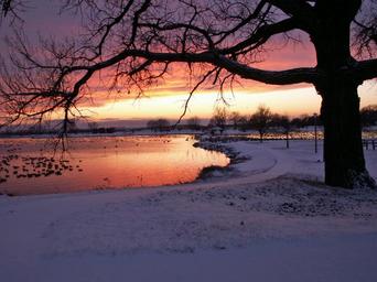 | Keywords: winter snowy trees woods water sunset evenings dusk orange sky reflections ponds reflective surfaces sunlight twilight white frosty grounds lands bright plants flora ducks birds geese swimming nature natural outdoors scenery scenic landscapes freezing weather cold climates seaons icy ice crystals snowflakes snowfall frozen cool environment |