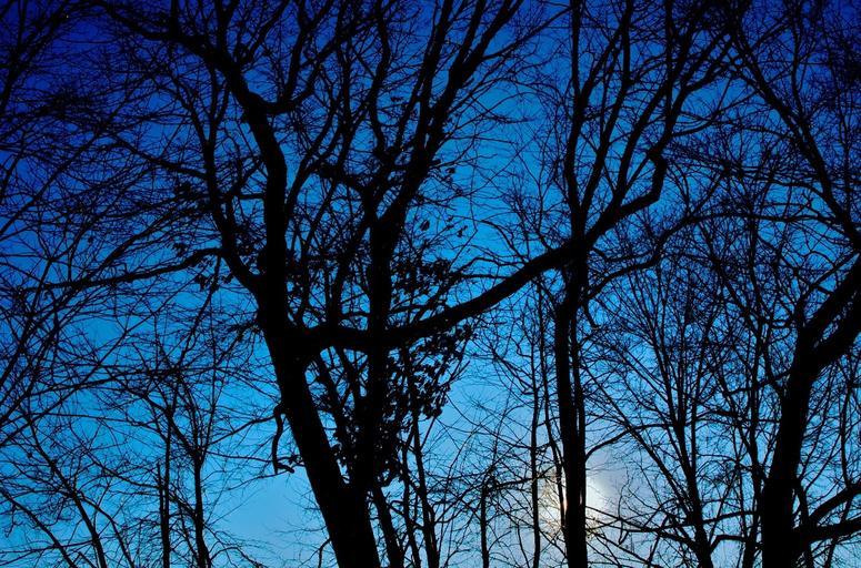 Keywords: winter trees silhouette sunset blue black cool tones white nature