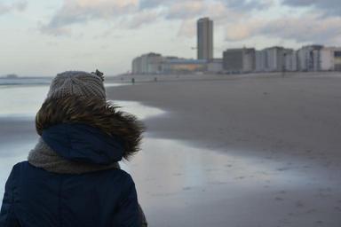 Keywords: winter winter clothing walk on the beach woman jacket people hood beach oostende buildings view