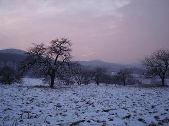 Keywords: wintry red violet sundgau snow winter cold iced romantic frost frozen light hoarfrost meadow trees sunset
