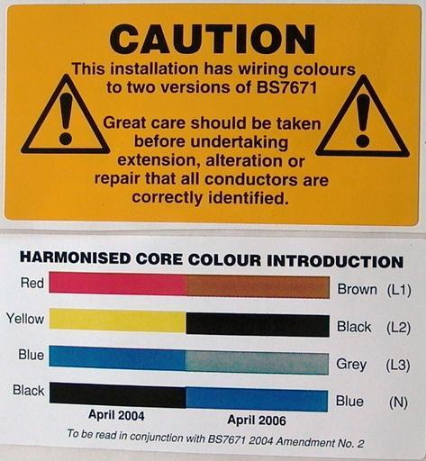 | Keywords: Wiring colours.jpg en U K Electrical installation wiring colour color standards 2004-6 own Francis E Williams 2010-12-02 Pictures of actual warning labels used on distribution boards in the U K to warn the contractor who may undertake future work Safety labels |