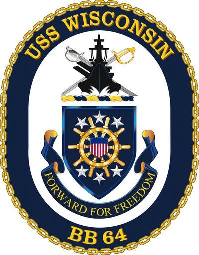 | Keywords: Wisconsin crest.jpg Crest of USS Wisconsin BB-64 US Navy via http //www navsource org/archives/01/64a htm Navsource org and http //www tioh hqda pentagon mil/Catalog/Heraldry aspx HeraldryId 14121 CategoryId 8450 grp 5 menu Uniformed 20Services from search tioh hqda pentagon mil Uploaded February 2006 US Navy /Blazon SHIELD Azure Dark Blue a ship's wheel or between an arc of three mullets in chief and an arc of three mullets in base Argent and charged with an escutcheon paly of thirteen Argent and Gules with a chief Azure CREST On a wreath of the colors Or and Azure the silhouette of a battleship affronté of the second upon the waves of the sea Argent in front of a cutlass and a saber points to base saltirewise of the like the saber hilted Gold MOTTO On a scroll Azure doubled Or the motto FORWARD FOR FREEDOM inscribed in Gold letters SEAL The coat of arms emblazoned in full color upon a white oval enclosed by a blue collar edged on the outside with gold chain and bearing the inscription USS WISCONSIN above and BB 64 below in gold letters Symbolism SHIELD Dark blue and gold are the colors traditionally associated with the Navy The ship's wheel represents navigation and leadership and reflects the USS WISCONSIN's global capabilities and seaworthiness The smaller shield from the United States Coat of Arms represents our national heritage and appears on the Wisconsin State flag During World War II the USS WISCONSIN-a virtual floating fort-played a vital part in the establishment of U S naval power as second to none She earned five battle stars for her World War II service and one for her outstanding performance during the Korean War CREST The ship's silhouette is that of a battleship designed to combine the largest guns with the strongest armor in order to inflict and absorb tremendous damage The crossed sword and cutlass represent the combat readiness of the officers and enlisted personnel aboard the USS WISCONSIN PD-USGov USS Wisconsin BB-64 64 number United States Navy battleships emblems |