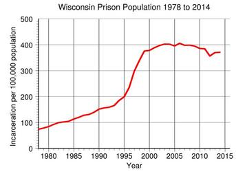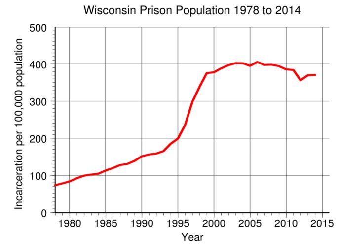 | Keywords: Wisconsin Prison Population.svg en Wisconsin prison incarceration rate per 100 000 population from 1978 to 2014 Data from http //www bjs gov/index cfm ty nps BJS 2016-05-11 own Delphi234 other versions current annually Generated with Wikimedia SVG Chart SVG Chart/box cc-zero Prisons in Wisconsin Imprisonment and detention rates in the United States |