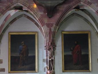 | Keywords: Wissembourg StPierre-Paul26.JPG fr Alsace Bas-Rhin Wissembourg Eglise abbatiale Saints-Pierre et Paul Peintures de Saint-Pierre et Saint-Paul 1843-1844 own Rh-67 2010 cc-by-sa-3 0 IM67011559 Artwork / Œuvre d'art / Kunstwerk oil canvas 260 cm de large Abbatiale Saints-Pierre et Paul Wissembourg IM67012074 object history Deux tableaux représentant l'un saint Pierre et l'autre saint Paul furent demandés à la direction des Beaux-Arts du Ministère de l'intérieur pour la décoration de l'église en 1843 par l'intermédiaire du député du Bas-Rhin Max Théodore Cerfberr Ce souhait fut accueilli favorablement et les tableaux furent exécutés aux frais du gouvernement par le peintre Pierre André Victor Félix Cassel qui avait fait l'objet de recommandations particulières à l'occasion de la demande En novembre 1843 Cerfber demanda au curé Paulus des renseignements dimensions nécessaires à l'artiste pour l'exécution et lui joignit deux esquisses pour avis A D 67 2 G 544 /B103 esquisses non conservées ce qui situerait la mise en oeuvre au plus tôt à la fin 1843 puis sans doute en 1844 other versions Ralph Hammann PD-old accession number Nave of Sts Peter and Paul Church Wissembourg Church paintings in Bas-Rhin Photographs of Wissembourg by Ralph Hammann Neoclassical church paintings in Alsace 19th-century church paintings in Alsace 19th-century paintings of Saint Peter Paintings of Saint Peter in France Paintings of Saint Paul Gothic revival statues in Bas-Rhin Sandstone statues in Bas-Rhin Dagobert I 19th-century statues in Alsace |
