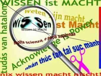 Keywords: Wissenistmacht.svg de Schriftzug Wissen ist Macht in verschiedenen Sprachversionen als Beispiel für eine Photoshopbearbeitung own Boonekamp 2006-05-27 Knowledge
