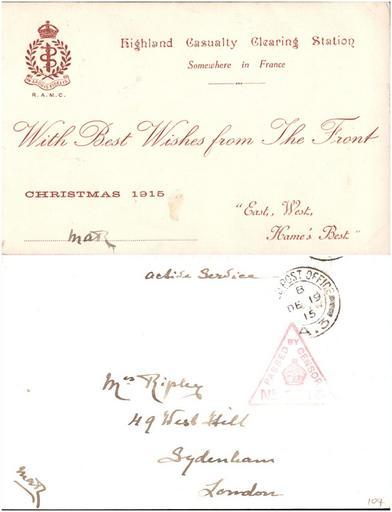 | Keywords: christmas public domain publicdomain ww1 nurse ripley nurseripley document text writing drawing sketch I'm finally coming back to Nurse Ripley's postcard album, which I hope to restart posting some time in the New Year. But I couldn't resist sharing this one now. As you can see, this one was sent by Margaret to her mother back in England. I believe that the Highland Casualty Clearing Station was at this time at Aire-sur-la-Lys, although other cards from Margaret around this date suggest she was in or around Amiens. Best Wishes to all my Flickr friends, and here's to some more fun, and lots more mysteries solved, in 2012 I'm finally coming back to Nurse Ripley's postcard album, which I hope to restart posting some time in the New Year. But I couldn't resist sharing this one now. As you can see, this one was sent by Margaret to her mother back in England. I believe that the Highland Casualty Clearing Station was at this time at Aire-sur-la-Lys, although other cards from Margaret around this date suggest she was in or around Amiens. Best Wishes to all my Flickr friends, and here's to some more fun, and lots more mysteries solved, in 2012 |