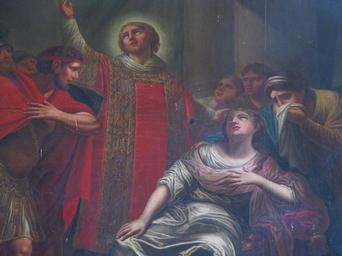| Keywords: Wiwersheim StCyriaque 65.JPG Alsace Bas-Rhin Wiwersheim Eglise St Cyriaque Notre-Dame des Sept-Douleurs Tableau St Cyriaque diacre XVIIIe own 2012 Ralph Hammann cc-by-sa-3 0 Artwork / Œuvre d'art / Kunstwerk Artwork Creator Joseph Melling Saint Cyriaque en habits de diacre exorcisant la fille de l'empereur Dioclétien Arthémia 1787 oil canvas cm 350 200 Eglise Saint Cyriaque Wiwersheim IM67010024 PM67000475 object history Cette toile datée 1787 et signée Joseph Melling proviendrait du maître-autel de l'ancienne église paroissiale dédiée à ce saint et dont le culte fut transféré dans l'édifice actuel en 1888 other versions Ralph Hammann PD-old-100 accession number Interior of Église Saint-Cyriaque de Wiwersheim Photographs of Wiwersheim by Ralph Hammann Taken with Canon PowerShot SX20 IS Objets monuments historiques in Wiwersheim Baroque church paintings in Alsace 18th-century church paintings in Alsace Saint Cyriacus 1787 oil on canvas paintings in France 1787 works in Alsace Objets monuments historiques in Bas-Rhin church paintings |