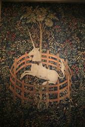 | Keywords: WLA metmuseum 1495 Unicorn captivity.jpg author The Unicorn in Captivity one of the series of seven tapestries The Hunt of the Unicorn La Licorne captive Tapisserie de la série de La Chasse à la licorne 捕獲された 角獣 (ゴブラン織り タペストリー 角獣狩り より) circa 1495 1505 silver tapestry silk gilt wefts cm 368 251 50 Institution The Cloisters credit line Gift of John Davison Rockefeller Jr January 29 1874 May 11 1960 1937 http //www metmuseum org/works_of_art/collection_database/the_cloisters/the_unicorn_in_captivity/objectview aspx collID 7 OID 70007568 www metmuseum org accession number 37 80 6 PD-old-100 Other versions <gallery> Stirling - la licorne en captivité jpg Modern copy of the tapestry Tapestry by unknown weaver - The Unicorn in Captivity - WGA24176 jpg Same picture The Unicorn in Captivity - Google Art Project jpg Same picture Unicorn in Captivity jpg Same picture </gallery> WLA metmuseum 37 80 6 shooting_brooklyn shooting brooklyn 28314321 N06 3315609906 The Hunt of the Unicorn |