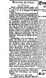 | Keywords: Wochenblatt für den Königlich-Bayerischen Gerichtsbezirk Zweibrücken - Nr 65 - 30. Mai 1848 - Anzeige Deutsche Tribüne (Ausschnitt).png en announcement for the german newspaper Deutsche Tribüne to reprint in 1948 1948-05-30 Google Books via Bayerische Staatsbibliothek http //books google de/books id 2L9DAAAAcAAJ pg PA46-IA26 G Ritter Custom license marker 2013 02 20 PD-old-70-1923 Deutsche Tribüne | ||||