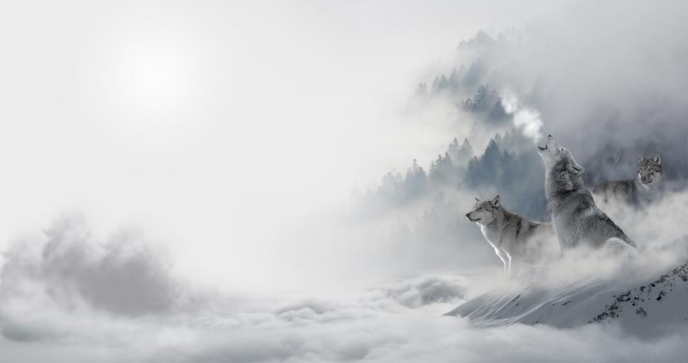 Keywords: wolf wolves snow wolf landscape atmosphere animal world predator wild animal snow pack mountains valley nature mood clouds fog winter mood cold frost trees forest winter wintry idyllic atmospheric firs mystical fir forest magic forest magic fairy tales 4 k