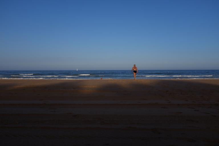 Keywords: woman beach swimsuit female summer vacation sea ocean person sand outdoor leisure freedom water evening swimming alone