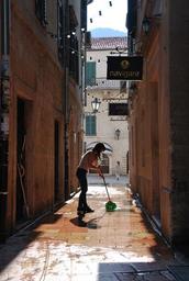 Keywords: woman cleaning sweeping street silhouette broom building between reflection italy