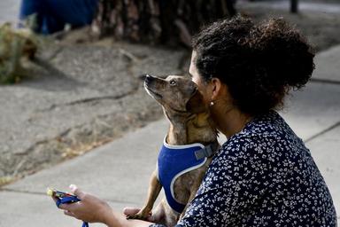 Keywords: woman dog pet people female animal lifestyle together friendship togetherness close friends