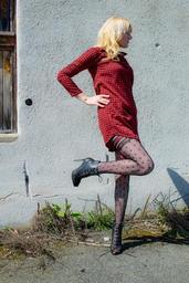 Keywords: woman dress shoes clothing pantyhose blond high heels paragraph stockings fashion legs women suspenders red red dress sexy photo model wall road