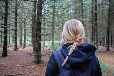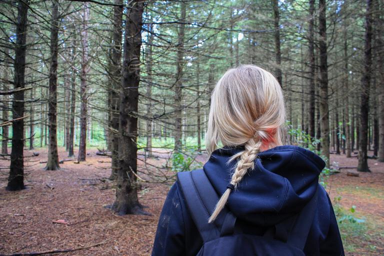 Keywords: woman girl hiker backpacker trek path adventure forest woods trees