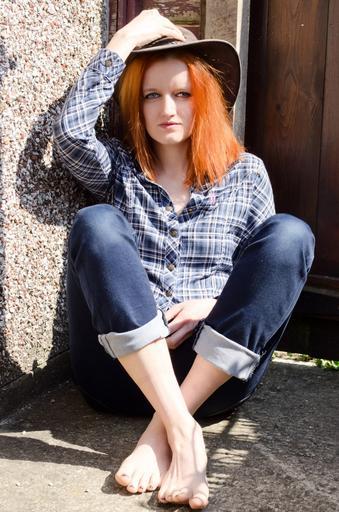 Keywords: woman girl people sitting waiting hat fashion season spring summer sun heat face hair red eyes view image look background kamila