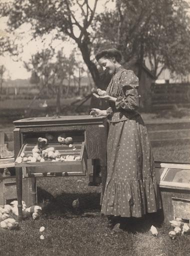 Keywords: farm life farmlife poultry women outdoor monochrome Photographer: Reuben R. Sallows (1855 - 1937) Description: Woman stands in outdoors by incubator holding baby chick in outstretched hand; wears dark dress with circular dotted pattern, ruffled hem, long puffed sleeves and high collar, left shoe visible; upswept hair; incubator with open door and filled with chicks on right; chicks on ground at extreme left and to right of woman's foot; large tree in background; date (1910/52) in pencil and Sallows stamp in purple ink on back Object ID : 0411-rrs-ogohc-ph View additional photographs by Sallows that are held in other collections at the Reuben R. Sallows Digital Library. Order a higher-quality version of this item by contacting the Huron County Museum (fee applies). Photographer: Reuben R. Sallows (1855 - 1937) Description: Woman stands in outdoors by incubator holding baby chick in outstretched hand; wears dark dress with circular dotted pattern, ruffled hem, long puffed sleeves and high collar, left shoe visible; upswept hair; incubator with open door and filled with chicks on right; chicks on ground at extreme left and to right of woman's foot; large tree in background; date (1910/52) in pencil and Sallows stamp in purple ink on back Object ID : 0411-rrs-ogohc-ph View additional photographs by Sallows that are held in other collections at the Reuben R. Sallows Digital Library. Order a higher-quality version of this item by contacting the Huron County Museum (fee applies).
