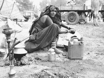 Keywords: woman india water working well rural village looking jug can container