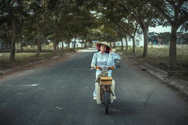 Keywords: woman moped asia vehicle transport person smiling hat happy street road alley motorbike travel driving riding