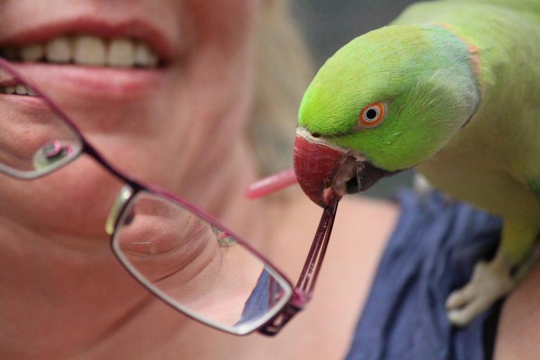Keywords: woman parrot glasses cheeky bill snap detention nature bird park bird green obstinately animal head animal world zoo