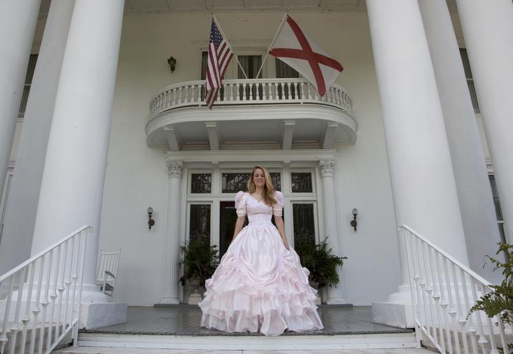 Keywords: woman pretty marriage evening dress dress mansion old antebellum south architecture lifestyle historical house residence vintage shorter mansion estate eufaula alabama usa