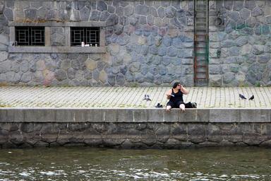 Keywords: woman river vltava female person leisure one riverside shore call read book ladder fun
