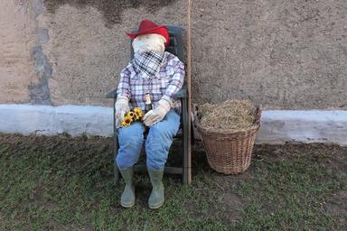 Keywords: woman of straw sitting basket hay decoration autumn decoration