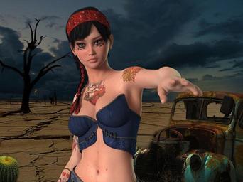 Keywords: woman tattoo hair decorated skin face navel jeans cloth corsage desert old car stainless tree kahl apocalypse cactus sky clouds