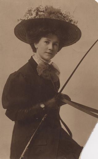 | Keywords: portraits women people monochrome Photographer: Reuben R. Sallows (1855 - 1937) Description: Studio portrait of woman dressed in dark riding habit holding a riding crop and reins; three-quarters view, facing right; wears wide brimmed hat with flowers, light high-necked lace collar, dark gauze-like bow tie; dark leather gloves, watch on right wrist; Post card marking on back, addressed to Miss Lottie Green, 508 Fort Street, Port Huron, Mich message written Am just leaving for Bayfield, wish you were coming too, Florence Object ID : 0384-rrs-ogohc-ph View additional photographs by Sallows that are held in other collections at the Reuben R. Sallows Digital Library. Order a higher-quality version of this item by contacting the Huron County Museum (fee applies). Photographer: Reuben R. Sallows (1855 - 1937) Description: Studio portrait of woman dressed in dark riding habit holding a riding crop and reins; three-quarters view, facing right; wears wide brimmed hat with flowers, light high-necked lace collar, dark gauze-like bow tie; dark leather gloves, watch on right wrist; Post card marking on back, addressed to Miss Lottie Green, 508 Fort Street, Port Huron, Mich message written Am just leaving for Bayfield, wish you were coming too, Florence Object ID : 0384-rrs-ogohc-ph View additional photographs by Sallows that are held in other collections at the Reuben R. Sallows Digital Library. Order a higher-quality version of this item by contacting the Huron County Museum (fee applies). |