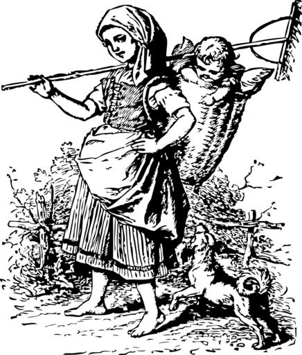 Keywords: woman worker basket back baby rake farm work