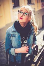 Keywords: woman young girl person blonde glasses female hair fashion face casual jeans jacket lifestyle looking lipstick red