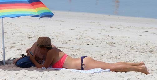 Keywords: woman young woman bikini sun hat parasol beach sea