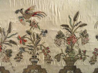 | Keywords: Woman's decorative apron detail, England, 1700-1750, silk tabby- Patricia Harris Gallery of Textiles & Costume, Royal Ontario Museum - DSC09339.JPG Exhibit in the Patricia Harris Gallery of Textiles Costume Royal Ontario Museum Toronto Ontario Canada This exhibit is old enough so that it is in the public domain and photography was permitted in the museum I took this photograph and release it into the public domain Daderot 2011-11-20 15 39 25 Daderot cc0 cc0 Patricia Harris Gallery of Textiles Costume at the Royal Ontario Museum 18th-century textiles Embroidery of England Aprons Close-ups of woven textiles |