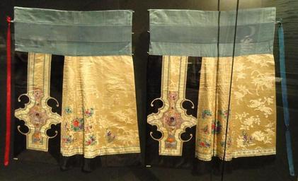 | Keywords: Woman's skirt (yulin baizhe qun), China, Qing Dynasty, c. 1880-1900, damask and satin - Patricia Harris Gallery of Textiles & Costume, Royal Ontario Museum - DSC09380.JPG Exhibit in the Patricia Harris Gallery of Textiles Costume Royal Ontario Museum Toronto Ontario Canada This exhibit is old enough so that it is in the public domain and photography was permitted in the museum I took this photograph and release it into the public domain Daderot 2011-11-20 15 50 37 Daderot cc0 cc0 Patricia Harris Gallery of Textiles Costume at the Royal Ontario Museum 1880s fashion Clothing of the Qing Dynasty |