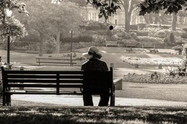 Keywords: women lady old hat sit alone abandoned bench park sad black white destiny mood people