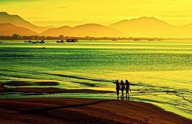 Keywords: beach dog walk sunset play pet summer water outdoor time travel blue sky adventure coast activity tropical sunrise power active bond people father sunshine love recreation parents four family energy relationship