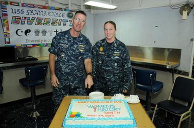 | Keywords: Women’s History Month event 150324-N-XO016-154.jpg en 150324-N-XO016-154 YOKOSUKA Japan March 24 2015 Cmdr Thomas Gorey executive officer of the submarine tender USS Frank Cable AS 40 and Chief Master-at-Arms Natalie Dymond cut a cake during an event celebrating Women ™s History Month March 24 Frank Cable is in Yokosuka for a port visit that will include various community service events and engagements with local commands Frank Cable forward deployed to the island of Guam conducts maintenance and support of submarines and surface vessels deployed in the U S 7th Fleet area of responsibility and is currently on a scheduled underway period U S Navy photo by Mass Communication Specialist 2nd Class Zac Shea/Released 2015-03-24 Petty Officer 3rd Class zachary shea https //www dvidshub net/image/1838128 150324-N-XO016-154 2015-03-26 00 03 YOKOSUKA JP PD-USGov-Military-Navy Women's History Month USS Frank Cable AS-40 Images from DoD uploaded by Fæ |