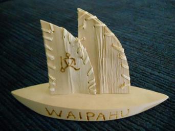 Keywords: Wood Burned souvenir from Waipahu, Hawaii.JPG en Wood burned souvenir from Waipahu Hawaii; miniature wooden boat own JGKlein 2010 Waipahu Hawaii Crafts Toy boats