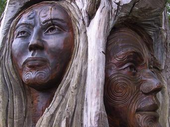 Keywords: wood carving man woman pair old maori new zealand head heads native american faces