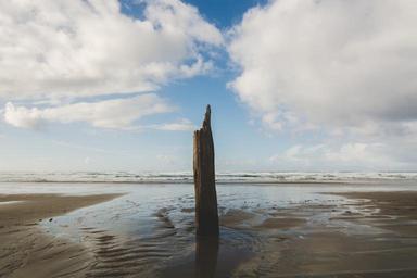 Keywords: wood post beach sand shore water ocean sea sky clouds