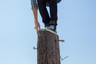 Keywords: wood post climbing shoes jeans denim hand blue sky