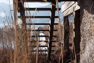 Keywords: wood stairs web boardwalk lake bank sky water blue rest sunny landscape nature winter haze reed phragmites australis grass poaceae marsh plant bluegrass