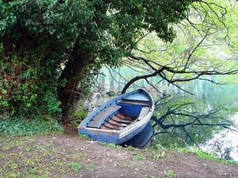 Keywords: wooden boat little bay lake shore reflections calm nature tree water silence branch peace background
