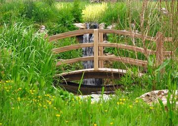 Keywords: wooden bridge bridge arched pond water ornamental green grass lush beautiful photo image