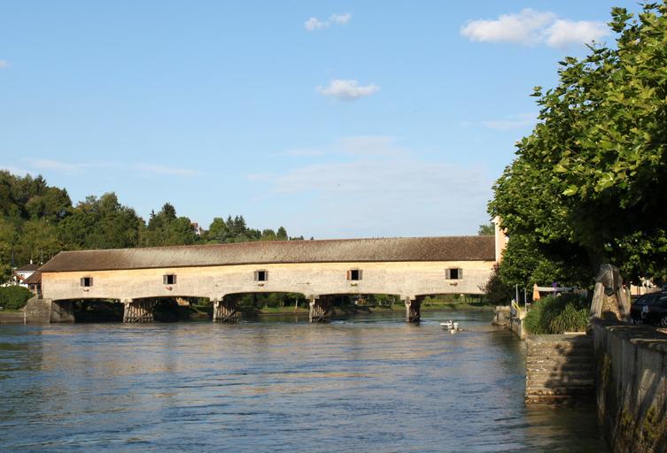 Keywords: wooden bridge historically bridge transition water nature landscape pedestrian bridge land trees sky transfer river rhine diessenhofen switzerland river landscape rheinbrücke green