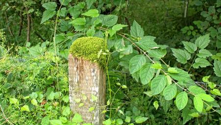 Keywords: wooden posts post barbed wire fence pasture pasture fence wiring demarcation fence post wood pile old fouling overgrown