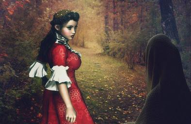 Keywords: woods autumn woman girl meeting forest nature landscape fall tree park outdoor trail foliage path season sunlight story fairytale
